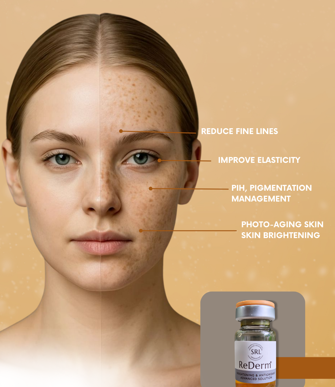 Rederm is a professional-grade skin treatment focused on Skin-Brightning AND ANTI OXIDATION developed by SKINRAY LABORATORIES It addresses challenges like damaged and stressed dermal layer, oxygen deficiency, oxidation, pH imbalances, dehydration and Pigment Skin. Confronted with these complex problems, Dermoadvance, dedicated to discovering extraordinary solutions, embarked on a meticulous examination and developed Rederm – a cutting-edge technology with focus on skin brighting and anti oxidation.